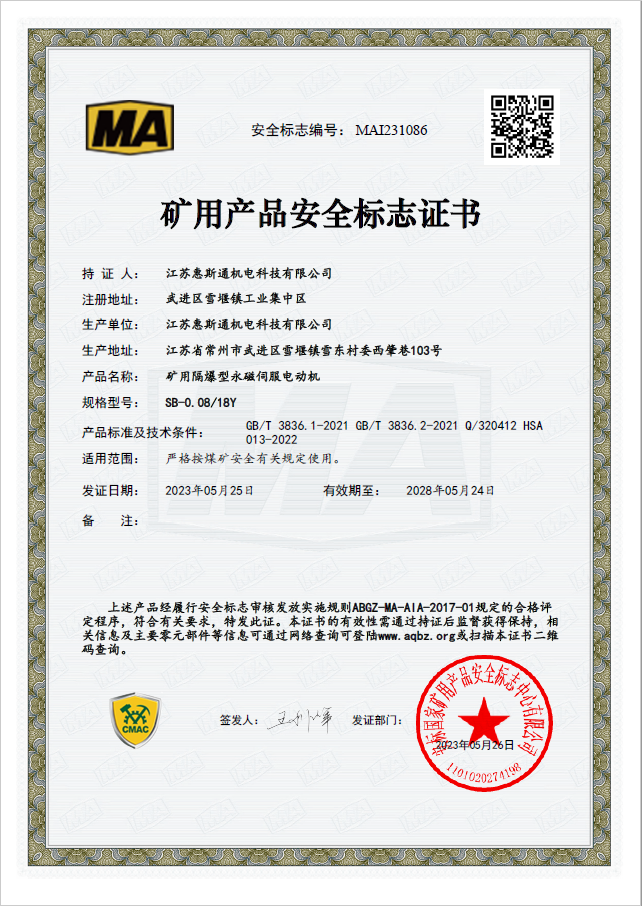 矿用产品安全标志证书MAI231086
