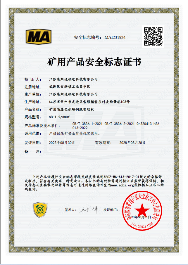 矿用产品安全标志证书MAI231952
