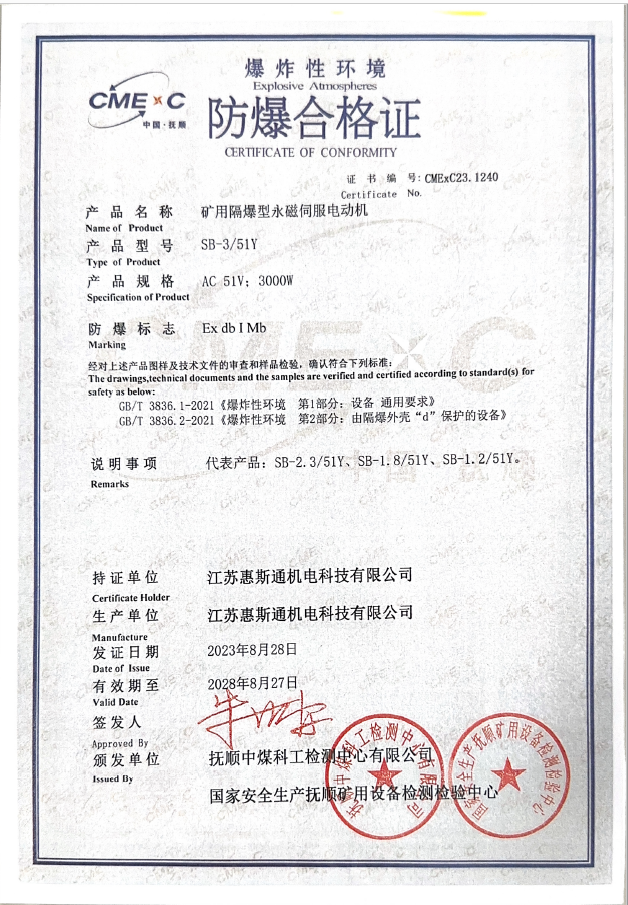 矿用隔爆型永磁伺服电动机证书1240